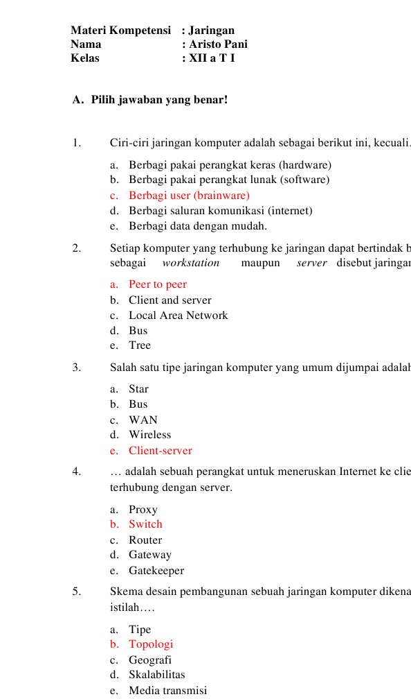 Mohon maaf apabila kurang lengkap dalam pembahasan mohon di cermati dan di cek kembali tambahkan di komentar apabila punya jawaban lain atau ada yang ingin menambahkan jawabannya. Soal dan Jawaban Produktif TKJ Kelas XI Semester 1 1. Pada kesempatan ini saya akan membagikan contoh soal produktif tkj yang bisa teman-teman gunakan untuk belajar.