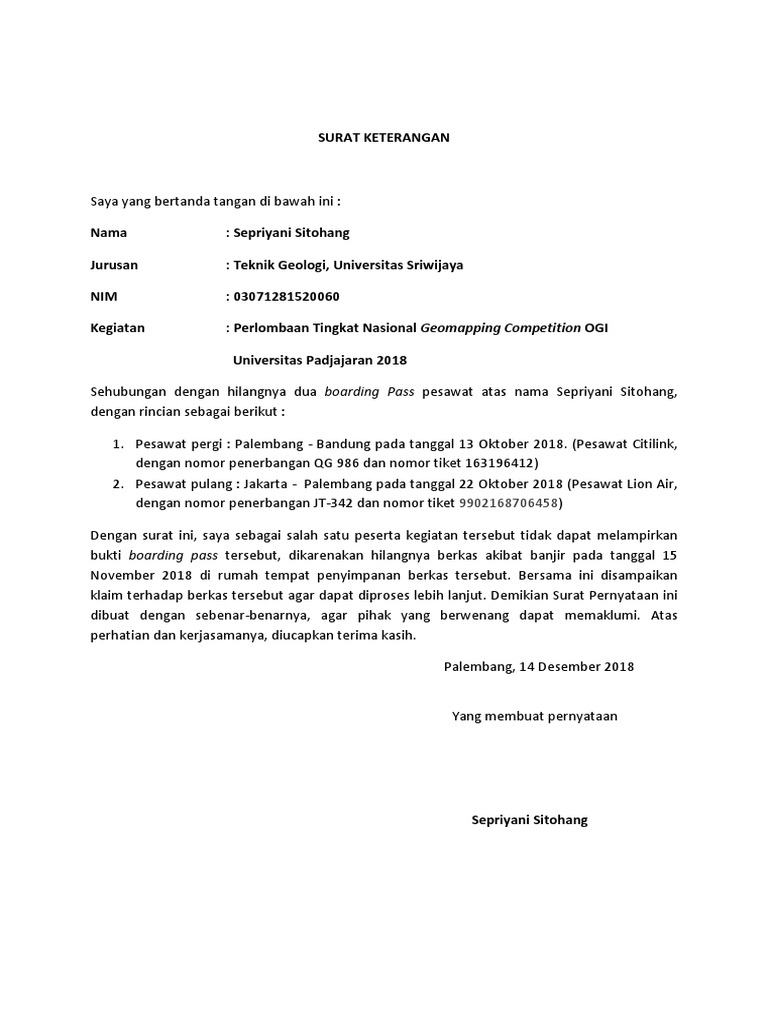 Contoh Surat Pernyataan Boarding Pass Hilang Cute766